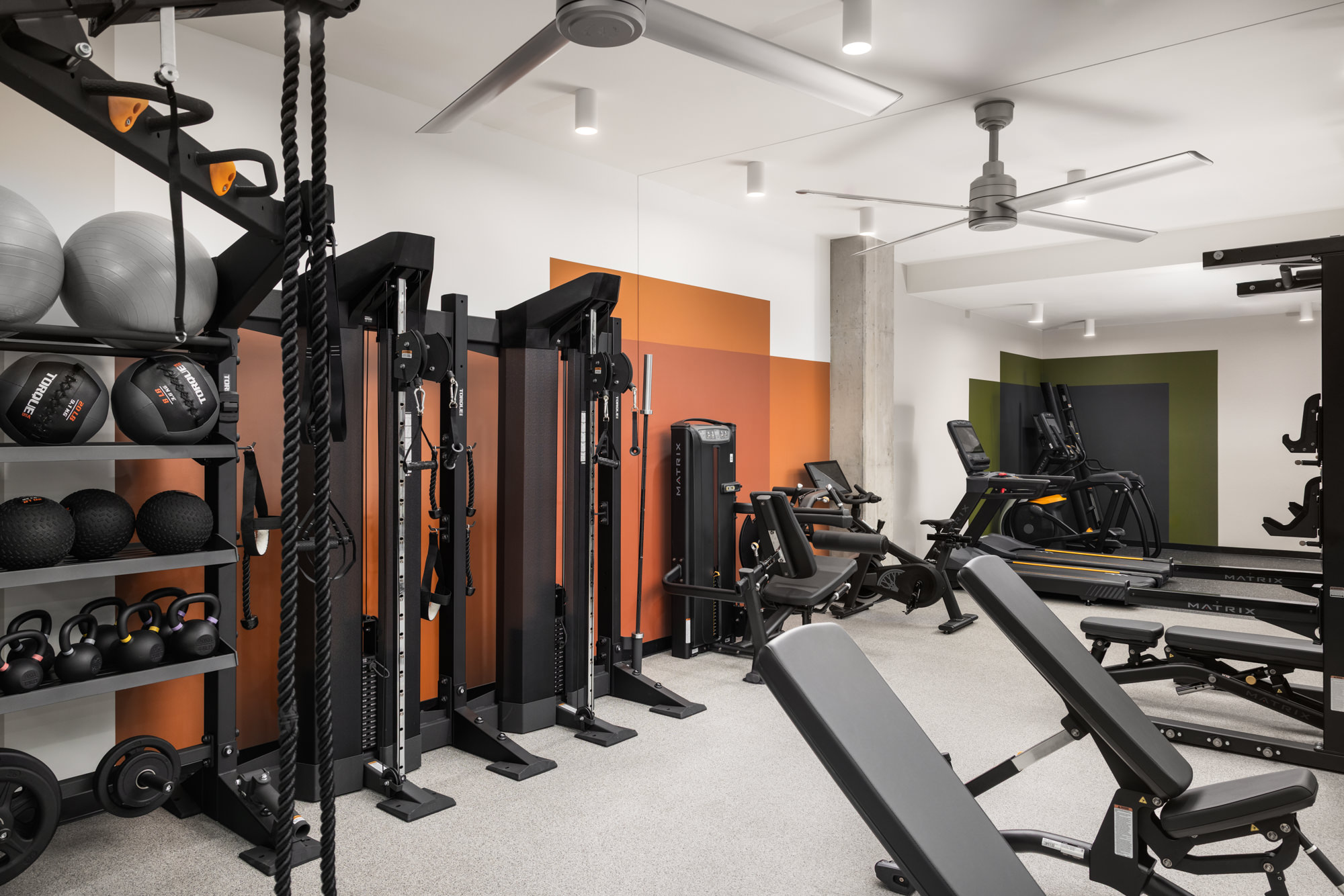 A fully equipped fitness studio featuring Matrix machines and CLMBR training equipment supports a wide range of workouts.